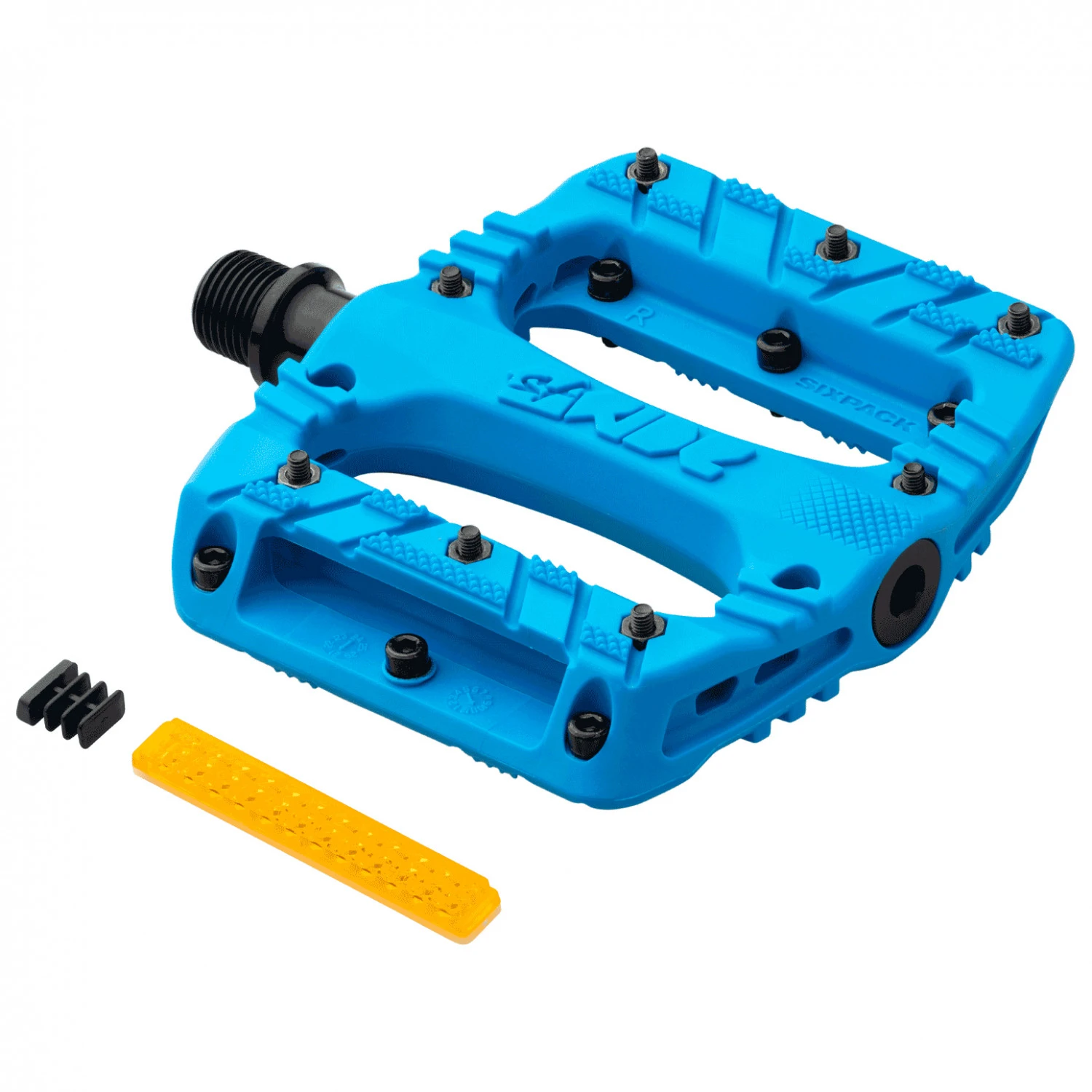 Das Kid’s 1st Ride Pedal von Sixpack Racing ist ein cooles Flatpedal für kleine Bikerinnen und Biker. Der aus glasfaserverstärktem Polyamid gefertigte Pedalkörper ist sowohl leicht als auch sehr robust. Die Plattformgröße ist mit 90mm x 90mm x 18,5mm sehr gut auf Kinder-Schuhgrößen ausgerichtet. Die wärmebehandelte CrMo-Achse sorgt ebenfalls für Stabilität, und acht schraubbare Stahlpins pro Seite bieten perfekten Halt des Schuhs auf den Pedalen. Die Kugellager sind mit Gummilippendichtungen vor dem Eindringen von Feuchtigkeit und Schmutz geschützt.
